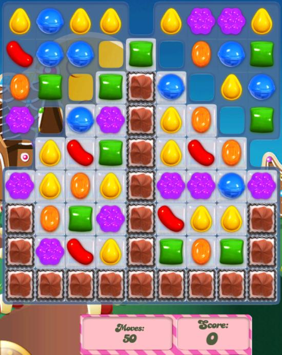 Behold the abominable Candy Crush Level 147. Brimming with the punishing meringue obstacles, as well as a weird "off map" geometry where candies start, and the lovable bomb to boot. One of the particularly hateful aspects of this level is the way in which it can force you to waste moves in the "off map" area, when no other moves are available. This old yeller-esque mechanic, which forces you to participate in the grim duty of your own failure is just... well... cruel.