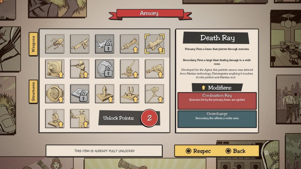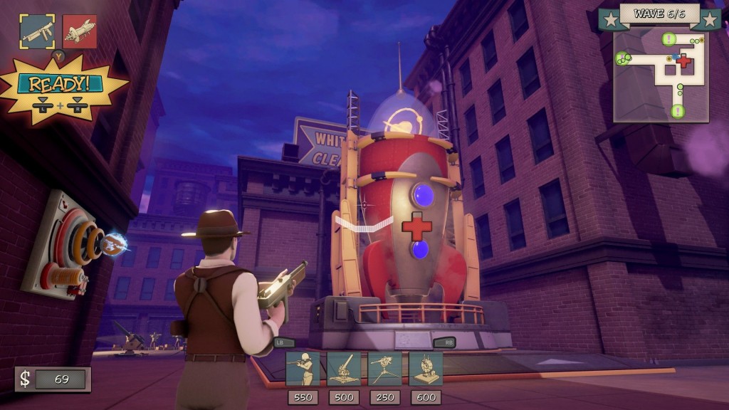 As you level up your characters, you can spend points to unlock new weapons or towers, although you can also spend those points on unlocking a set of upgrades for existing gear. You can respec for free if you make a mistake, so experimentation is encouraged. There are definitely some winners and losers among the weapons and towers. The Freeze Ray feels super overpowered, while weapons like the Grenade Launcher don't feel all that fantastic. Meanwhile, many of the towers feel either too short range or fire so slowly that they're not particularly effective. I found it rather hard in the late levels to pick 6 towers that I thought would actually be useful.