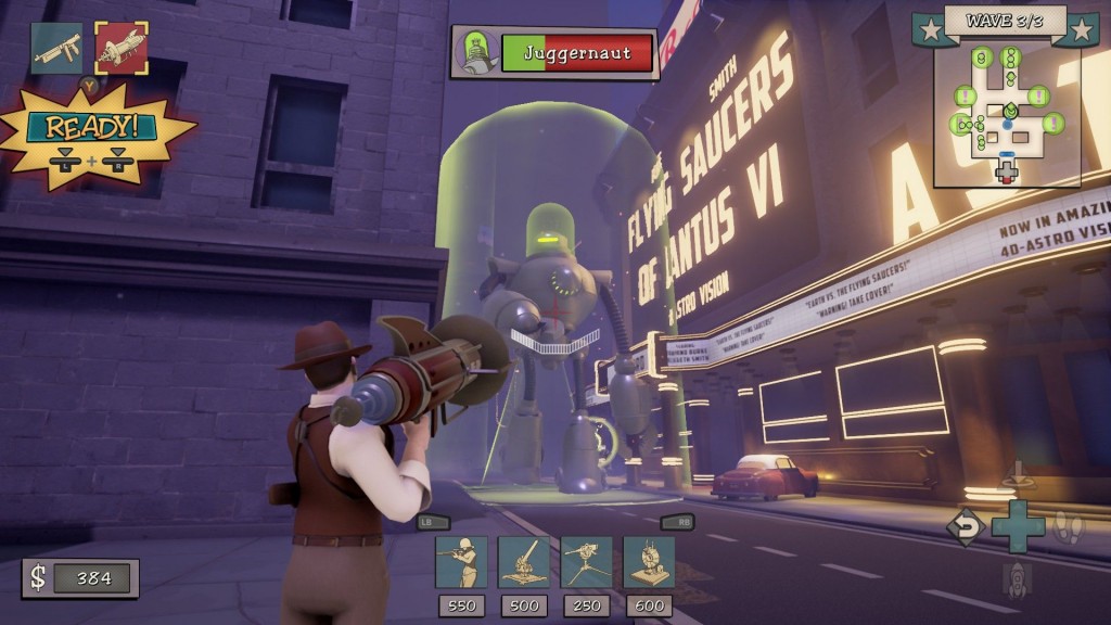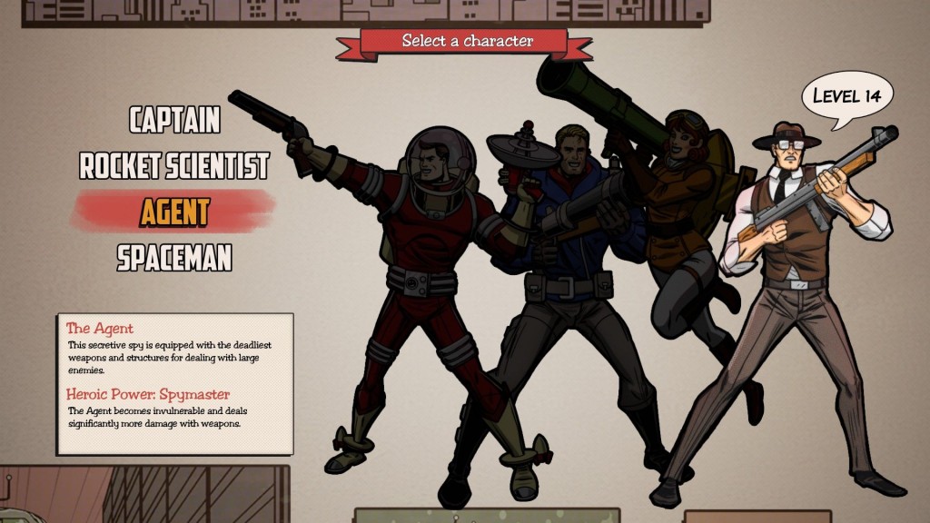 Fortified's aesthetic is inspired by pulp sci-fi of the 50's, which is also an inspiration that the Fallout series draws from. Martians are invading, and they're classic aliens in the style of The Day the Earth Stood Still or War of the Worlds. It's up to a group of four heroes to save the day! The heroes are similarly drawn from 50's pulp sci-fi, and include a "rocket scientist" that wears a jetpack, a captain, a spaceman, and an Area 51-style secret agent.