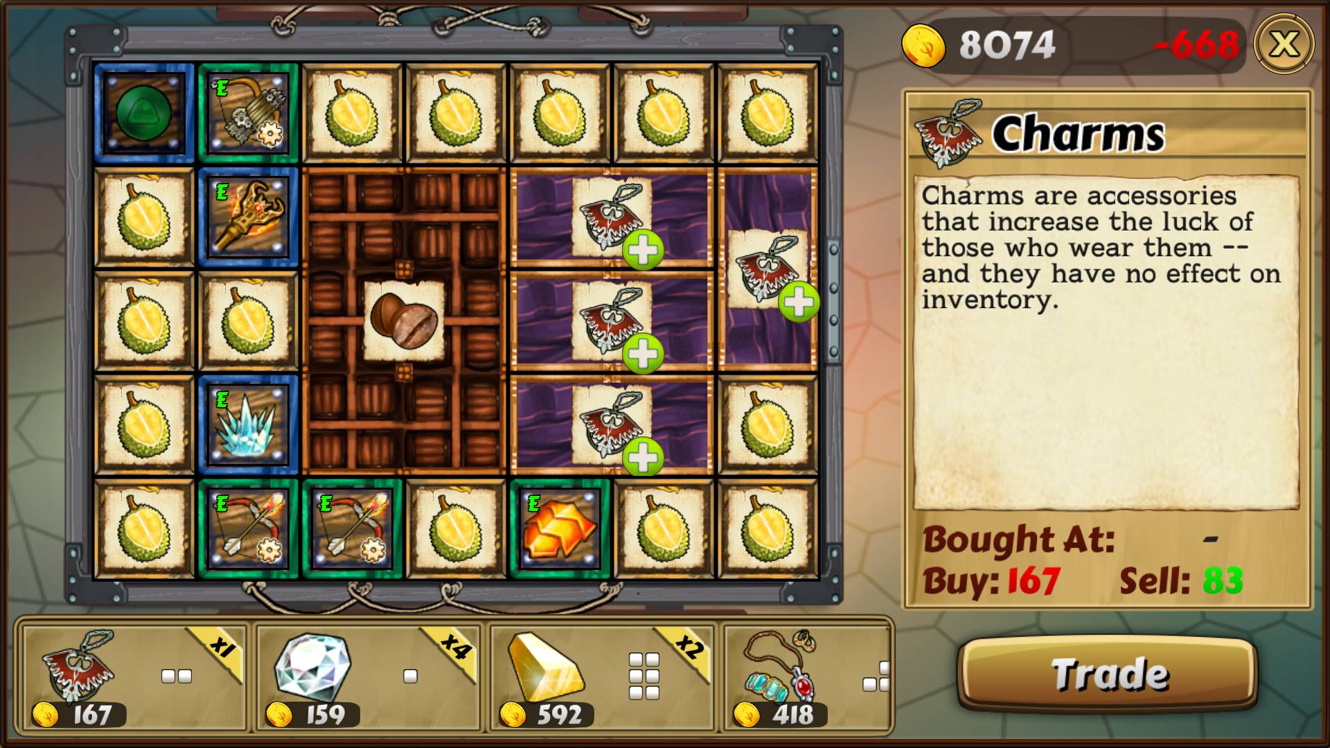For one, all goods must fit into your wagon. That sounds like no big deal, until you realize that most goods are oddly shaped. L shapes and T shapes are common in the early going, but quickly freaky shaped items start popping up. Rotating and shifting stuff around in your wagon is essential. It's a bit like Tetris, although I'm sure there's a term for this genre of game that I can no longer remember. :P Suffice it to say, it's a puzzle!